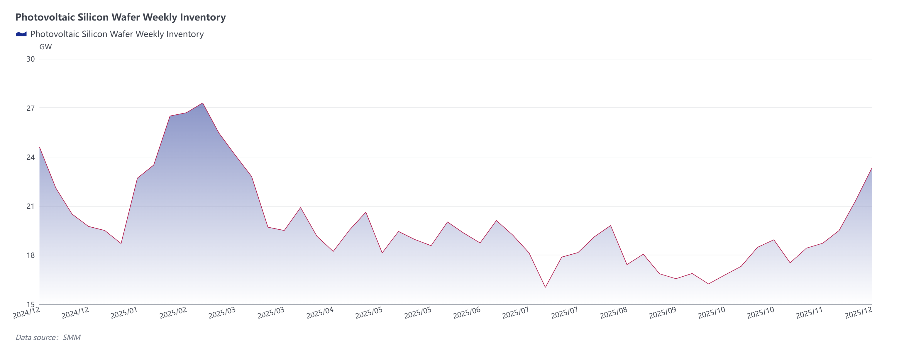 According to the latest SMM statistics, current upstream wafer finished product inventories amount to approximately 23.3 GW, while downstream raw material inventories stand at about 7 GW, bringing the total wafer inventory to over 30 GW, which is close to a reasonable level. Notably, external toll processing of wafers in December also reached nearly 8,000 mt. Except for two toll processing volumes of around 1,000 mt each that were halted, the remaining reductions were not significant. This portion of volume affects downstream raw material inventories, slowing down the digestion rate of these inventories.