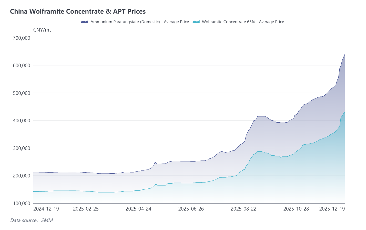 This week, China's tungsten market rose sharply. Domestic APT prices are quoted at CNY 640,000/ton (approximately USD 1,025/mtu), having surged by CNY 85,000/ton (approximately USD 140/mtu) within the week. Main reasons include: on one hand, major production regions such as Jiangxi and Hunan have very few remaining tradable mining quotas, and mines show little willingness to sell near year-end. On the other hand, multiple APT enterprises conducted concentrated maintenance this month. Market supply primarily ensures long-term contract deliveries, while spot sellers are holding back, forcing scattered urgent procurement to chase prices. Together, these factors drove overheated market sentiment and accelerated price increases.