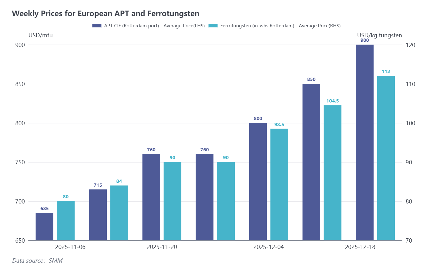 On December 19, SMM reported that the Ammonium Paratungstate (APT) CIF (Rotterdam port) price is USD 880-920 per metric ton unit (mtu), with an average of USD 900/mtu, up by USD 50/mtu from last week. Ferrotungsten (Rotterdam warehouse) price is USD 108-116 per kg W, with an average of USD 112/kg W, up by USD 7.5/kg W from last week.