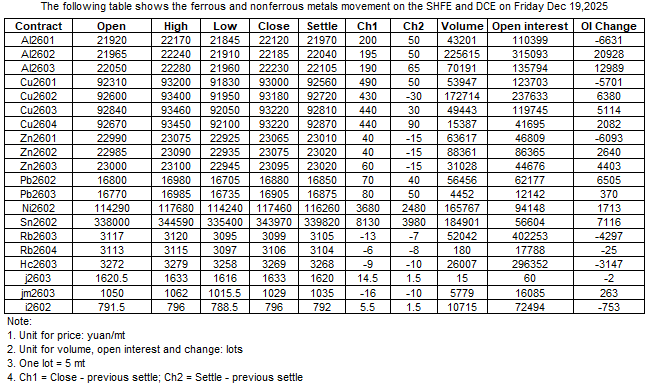 The following table shows the ferrous and nonferrous metals movement on the SHFE and DCE on 19 Dec , 2025