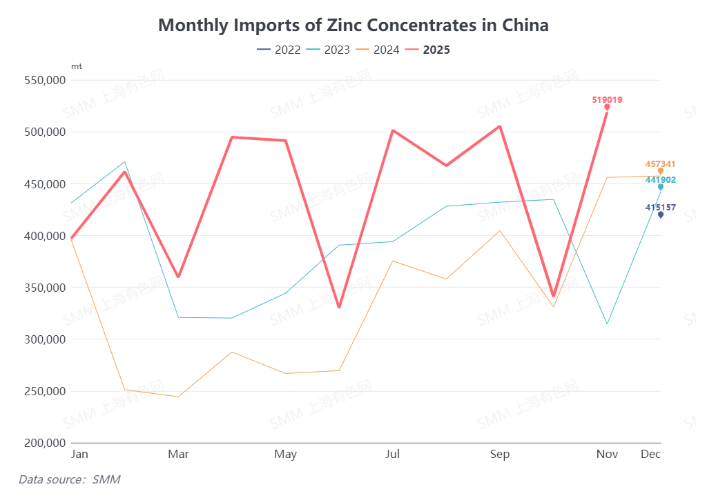 SMM believes the noticeable MoM growth in zinc concentrate imports in November largely met earlier market expectations, for the following reasons: