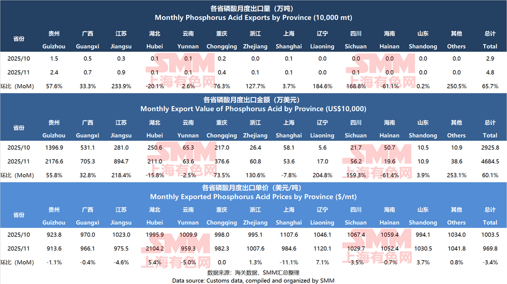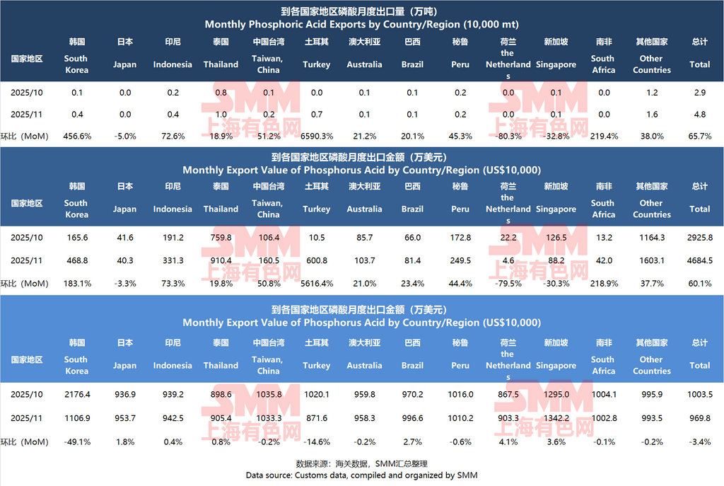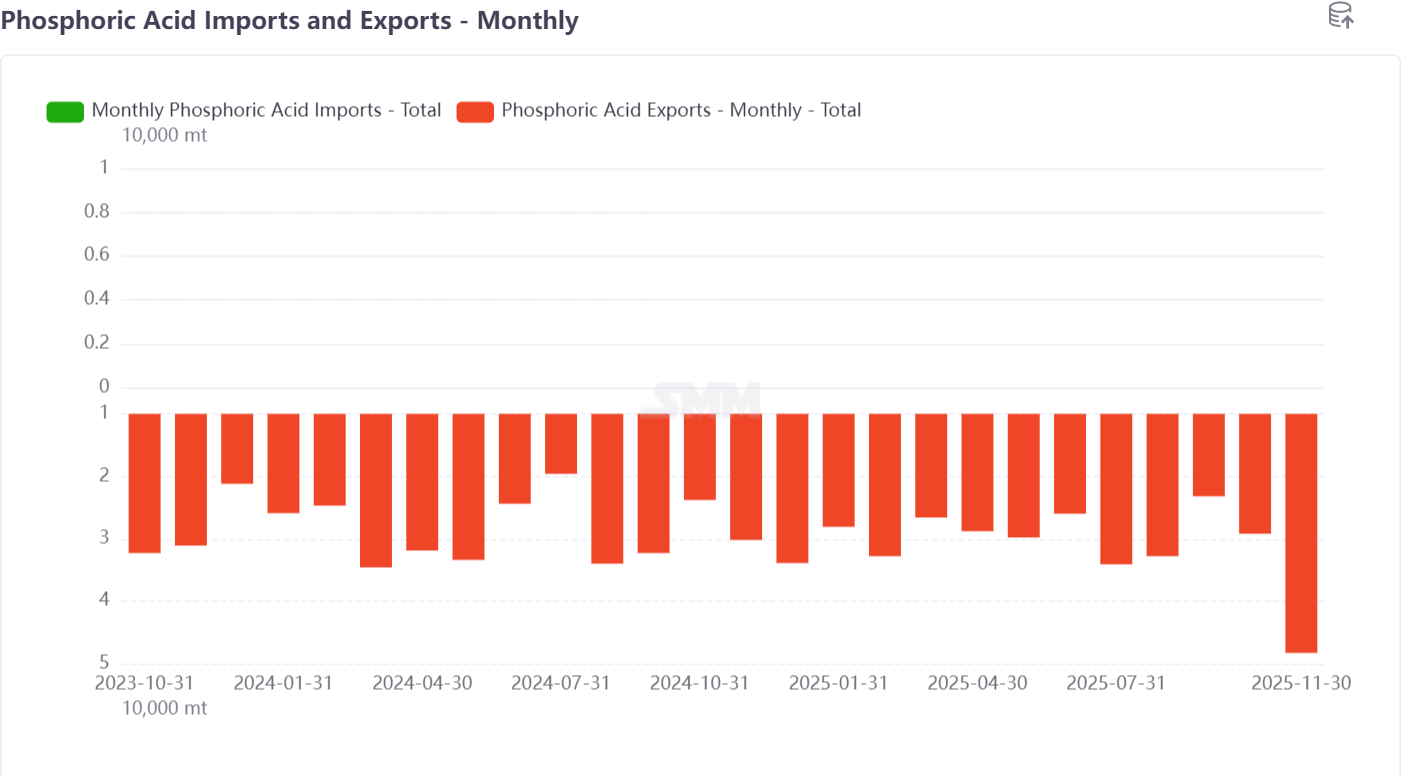 Highlights: In November 2025, China's total phosphate ore imports decreased by 4.0% MoM to 192,000 mt, while the total import value fell by 1.5% MoM. The comprehensive national import average price increased by 2.6% MoM. China's phosphoric acid exports surged by 65.7% MoM to 48,000 mt, though the export average price continued to decline, dropping 3.4% MoM to $969.8/mt. Imports by Thailand rose by 18.9% MoM, making it the largest export destination for the month.