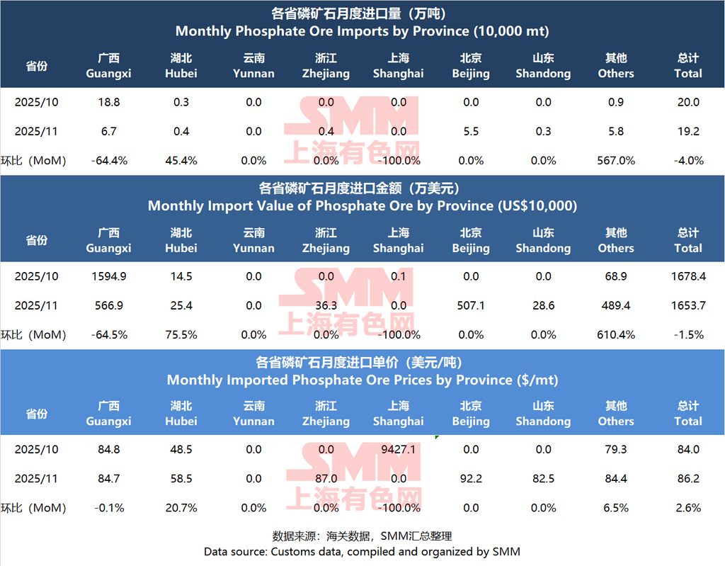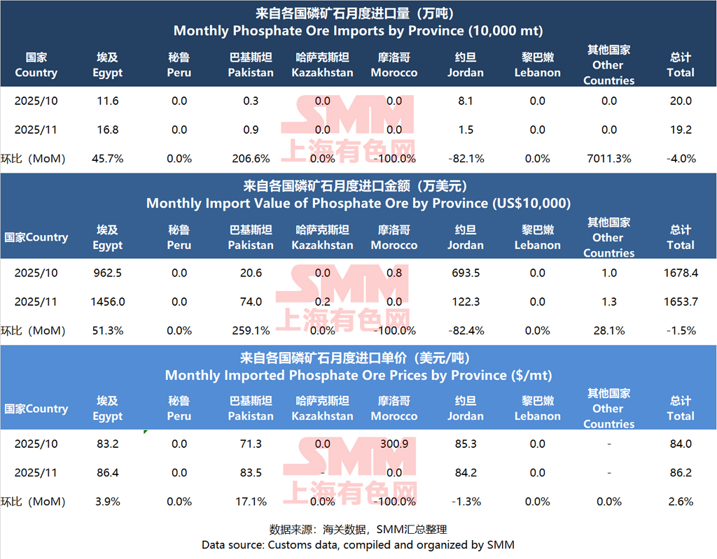 1. Phosphate Ore Imports: China's traditional major import sources for phosphate ore are Egypt, Peru, and Jordan, with primary importing provinces including Guangxi and Hubei. Major importing enterprises are coastal phosphorus chemical companies such as Sichuan Jinlang. In November, the main import sources remained the same as in October: Egypt and Jordan. Almost all imports were to Guangxi, accounting for over 90% of the total.