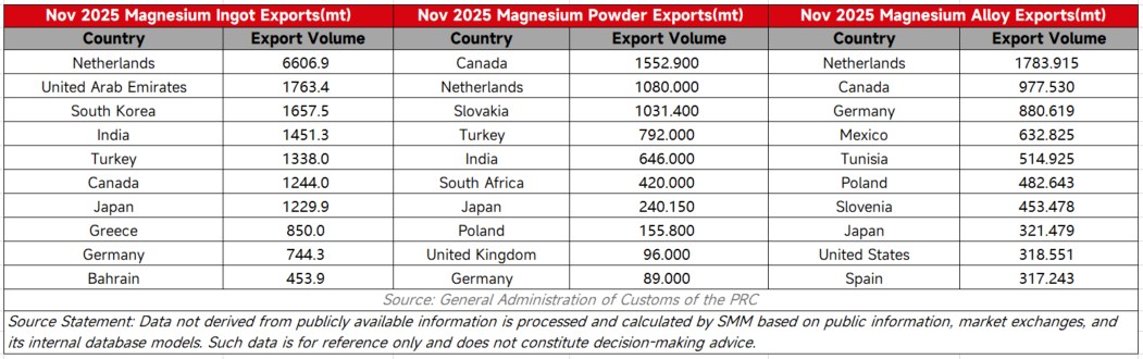 Regarding magnesium powder exports, Canada continues to maintain its position as a major demand country, with exports reaching 1,552.9 tons in November. Exports of magnesium powder to Europe also reached 1,080 tons during the same period. Magnesium alloy exports are still mainly destined for the Netherlands, with exports to the European region reaching 1,783.9 tons in November, reflecting growth in orders from this area.