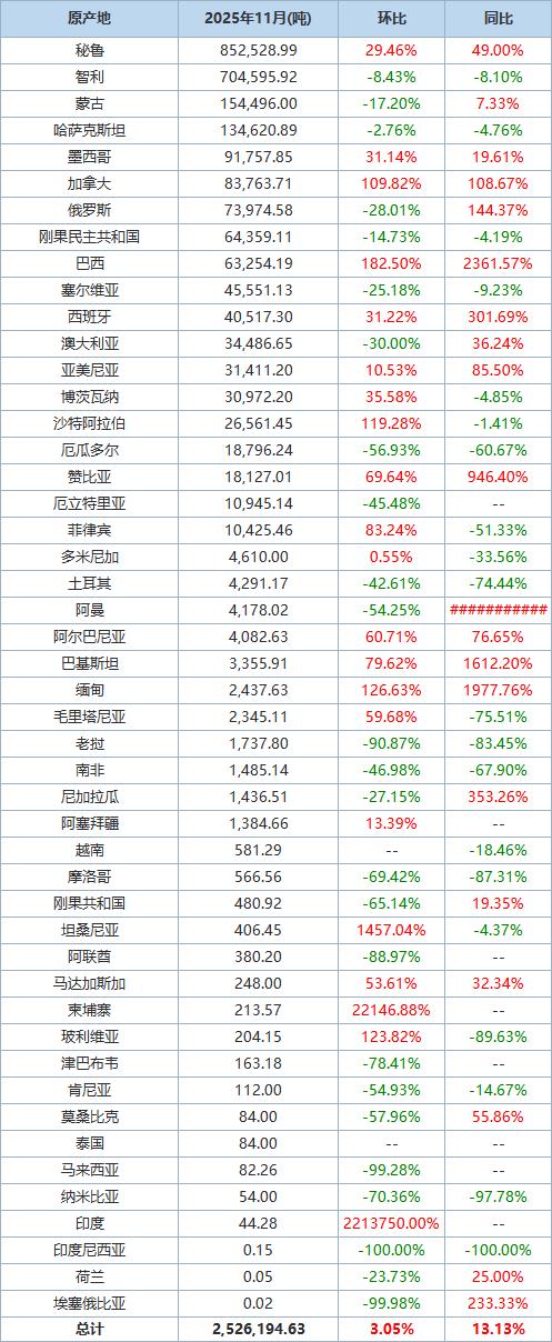 The following is a breakdown of China's imports of copper ores and concentrates in November 2025, compiled based on data from the official website of the General Administration of Customs:Breakdown of China's Imports of Copper Ores and Concentrates in November 2025