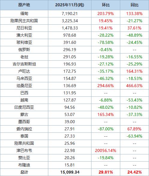 The following is a breakdown of tin ore and concentrates imports for November 2025, compiled from data on the official website of the General Administration of Customs: