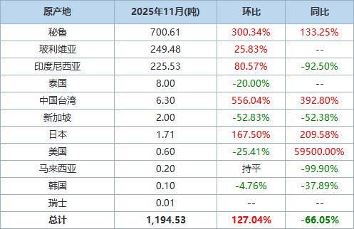The following is a breakdown of refined tin import data for November 2025, compiled from data on the official website of the General Administration of Customs of China:
