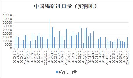 According to the latest data from the General Administration of Customs, China's imports of tin ore and concentrates in November 2025 were 15,099.34 mt in physical content (equivalent to approximately 5,578.04 mt in metal content), down 0.67% YoY, but up 12.73% MoM. Imports from Myanmar amounted to 7,190.21 mt (equivalent to approximately 1,636.05 mt in metal content), up 92.16% YoY and up 89.94% MoM. Imports from other countries excluding Myanmar totaled 7,909.13 mt (equivalent to approximately 3,941.99 mt in metal content) in November, down 17.29% YoY and down 3.58% MoM.