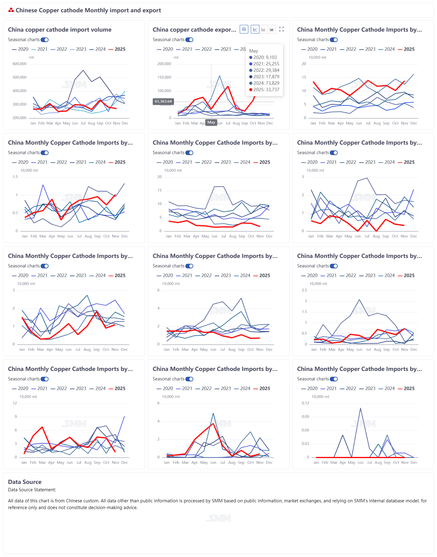 On the export front, China’s refined copper exports exhibited strong counter-cyclical momentum in November, exceeding 140,000 tons—second only to the June 2024 record of 157,700 tons. The surge was driven partly by the widening LME-COMEX spread, which incentivized traders to re-export bonded CME-registered warrants and November-arrival cargos. Another key driver was the significant expansion of the export window, prompting smelters to release substantial volumes to the international market. Notably, China’s copper exports showed greater destination diversification: in addition to traditional delivery destinations, market share in Europe, the Middle East, and Southeast Asia also expanded.