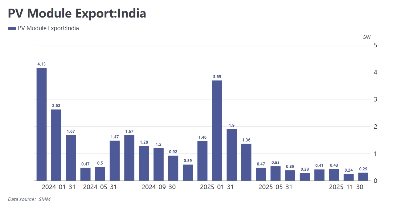 Exports of solar cells experienced explosive growth. In H1 2025, China's solar cell exports surged, with India absorbing approximately 50% of the total. According to SMM data, from January to November 2025, China's solar cell exports to India increased to over 49 GW from 33 GW in the same period last year, up 47.17% YoY. India's massive module capacity requires substantial solar cells as raw material, but its domestic cell capacity (29 GW) is severely insufficient. Consequently, despite India's significant efforts to block Chinese modules, its reliance on Chinese cells has deepened.