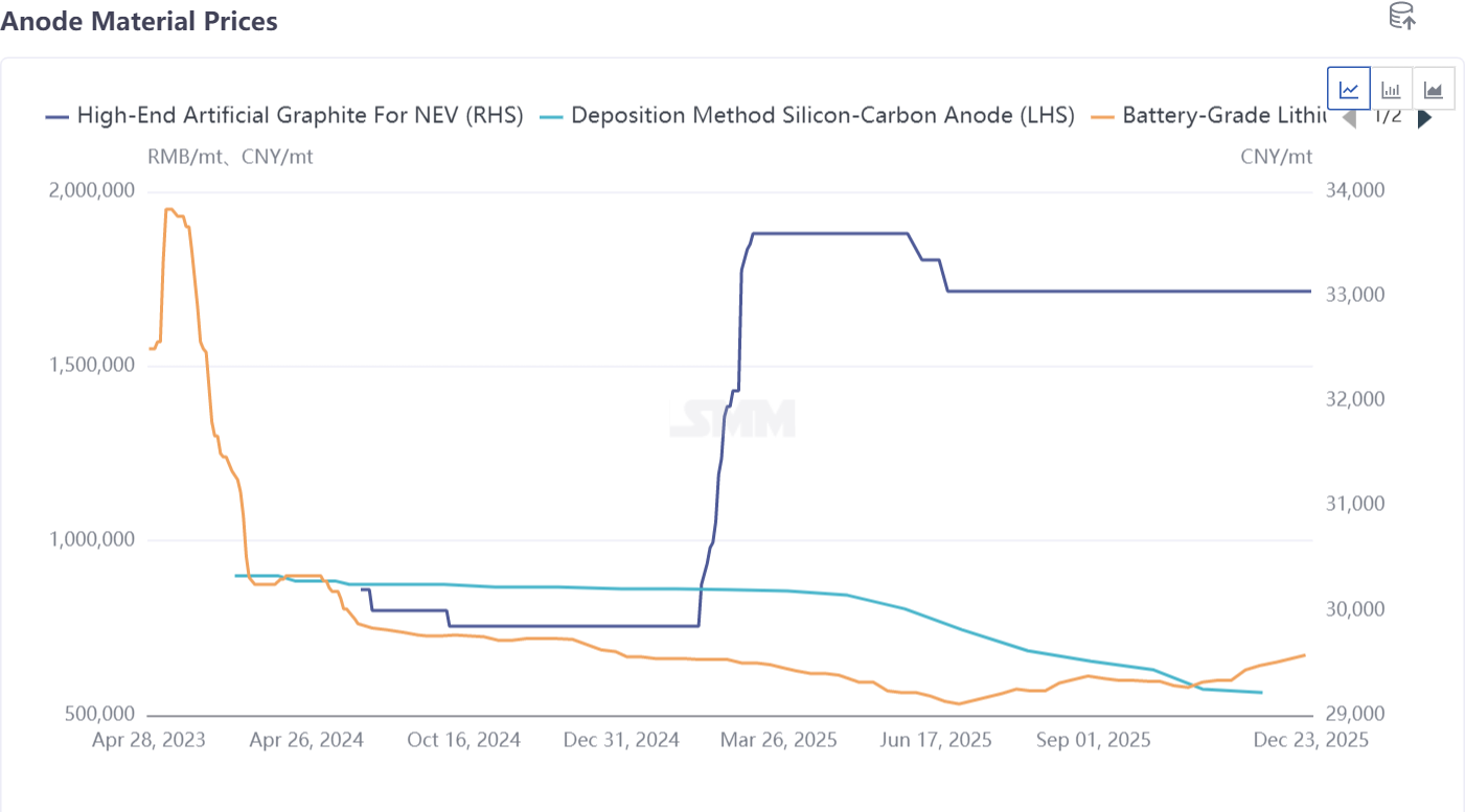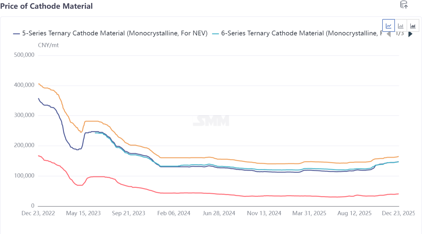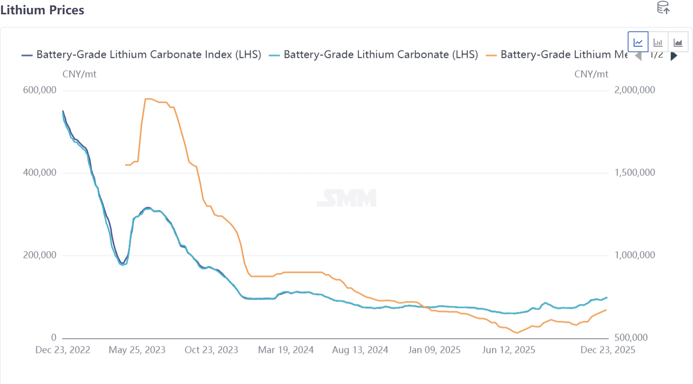 1) Lithium chemicals: Prices for lithium chemicals fell initially and then rebounded during the year, driving down lithium metal prices. In 2026, as lithium metal finds application in solid-state batteries, its price is expected to decline rapidly.