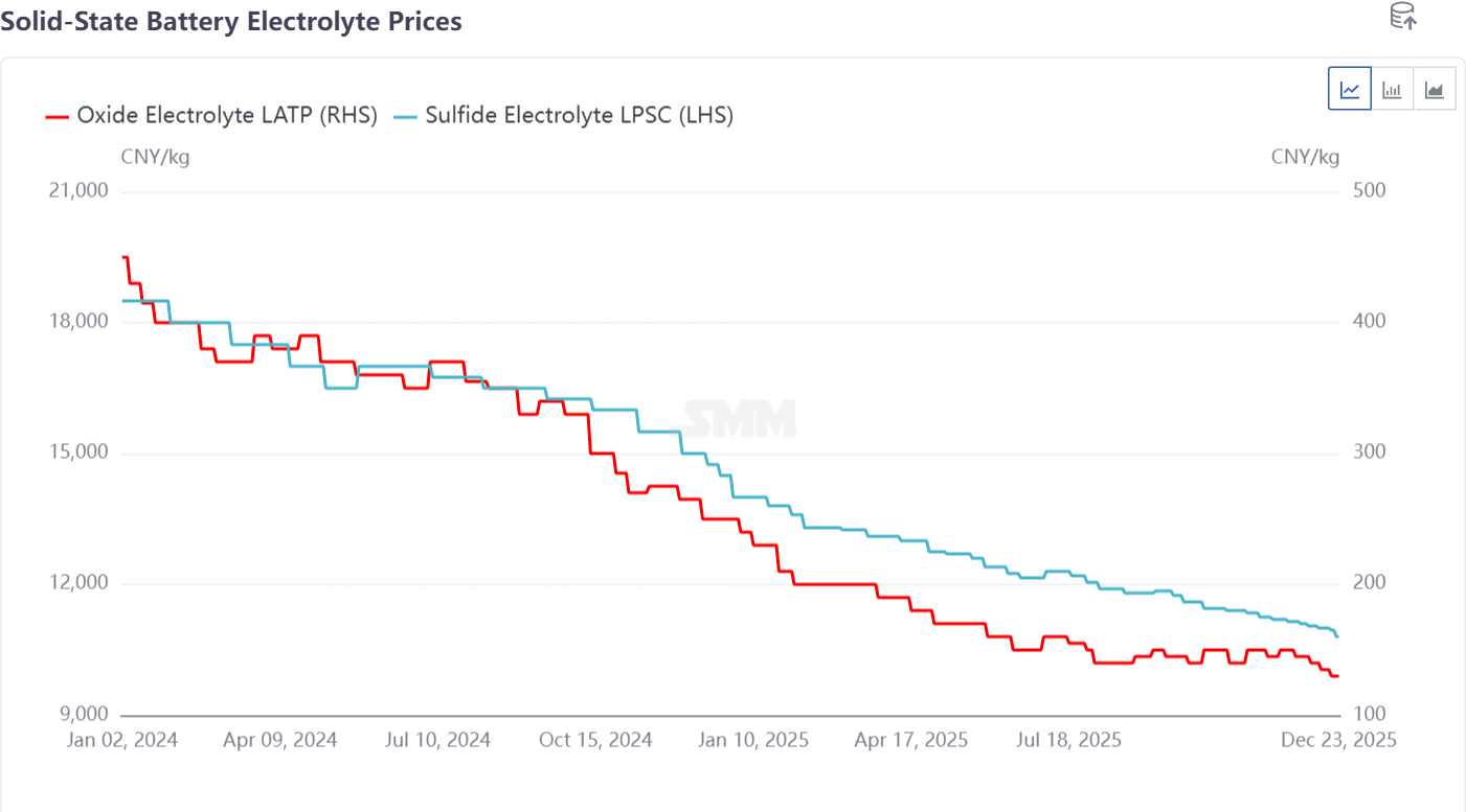 2) Prices for sulfide electrolyte LPSC and oxide electrolyte LATP also declined. LPSC fell from 20,000 yuan/kg at the start of the year to about 10,000 yuan/kg by year-end, and is projected to halve again to 5,000 yuan/kg by 2026. LATP dropped from 450 yuan/kg to 120 yuan/kg. With numerous LATP producers and low barriers to entry, price competition is intense. The price is expected to break below 100 yuan/kg in 2026, entering the 50 yuan/kg range.