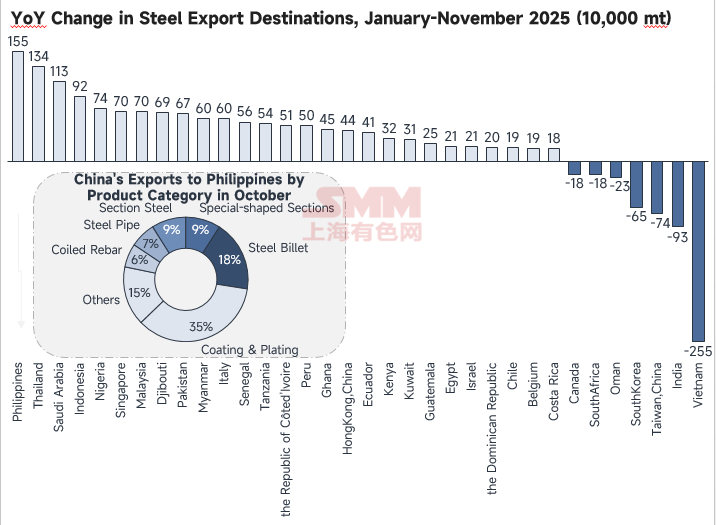 Specifically, among all steel product categories exported to the Philippines in November, coated and plated products surpassed steel billet to take the top spot, accounting for 35% of the total. This differs from October's data, where both categories each accounted for nearly 30% of the total. The main reason for this shift is that the price advantage of Chinese steel billet exports to the Philippines weakened compared to billet export prices from markets like Indonesia and Turkey at the time. Additionally, acceptance of high prices in the local Philippine market was low, and domestic traders were unwilling to offer lower prices, leading to reduced shipment enthusiasm. As for the stable performance of coated and plated products, the Philippines is a major global market for these products but faces significant undersupply due to its own limited capacity, resulting in heavy reliance on imports. China, leveraging low-price strategies and geographical proximity, has become the primary source of coated and plated steel imports for the Philippines. Furthermore, after Thailand imposed anti-dumping measures on galvanizing imports from China this year, the Philippines remains the only ASEAN country without trade restrictions on Chinese coated and plated products, which has greatly stabilized the volume of these exports from China to the Philippines.
