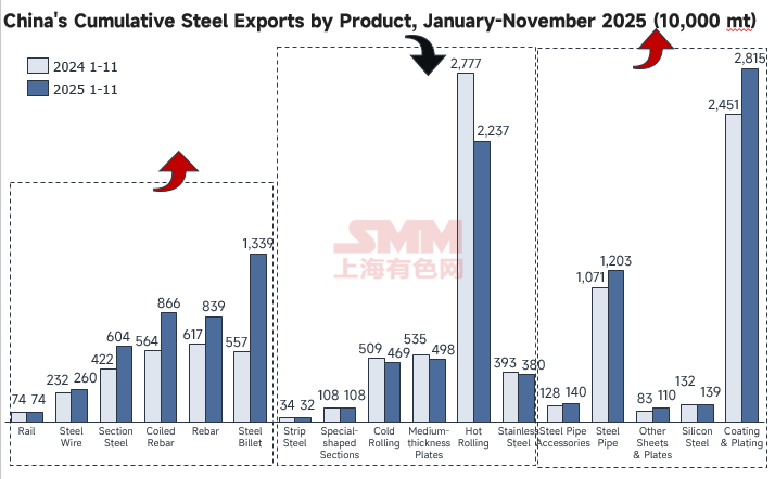 According to data compiled by SMM from the General Administration of Customs, China exported 11.4601 million mt of steel products in November 2025, including 2.1007 million mt of hot-rolled exports, up 215,900 mt MoM from October. The main reason was that Vietnam's anti-dumping duties on wide coils from China are expected to take effect soon, prompting traders to actively rush shipments, leading to the overall increase. Consequently, the cumulative YoY decline narrowed to -19.5%. Meanwhile, most long products performed well, with the cumulative YoY growth rates for coiled rebar and rebar reaching 53.7% and 35.9%, respectively, second only to the 140.4% for steel billet.