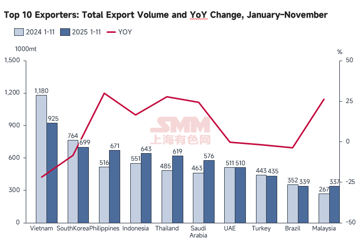 Looking back at the top 10 export destinations for China from January to November, Vietnam maintained its leading position with 9.25 million mt, followed by South Korea with 6.99 million mt, and the Philippines ranked third with a cumulative total of 6.71 million mt, making it the only market among the top three to achieve positive YoY growth.