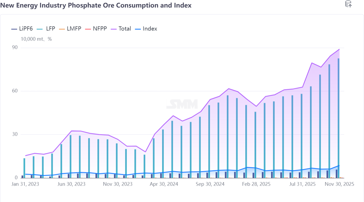 According to the consumption data and index of phosphate ore in the new energy industry, the consumption of phosphate ore in the NEV industry continued to climb in 2025, reaching nearly 900,000 mt by year-end. The main drivers were battery materials such as LFP, LMFP, and LiPF6. The demand for high-purity phosphoric acid and industrial-grade MAP from LFP and related materials has become increasingly prominent, becoming a key direction for the transformation and layout of phosphate chemical enterprises.