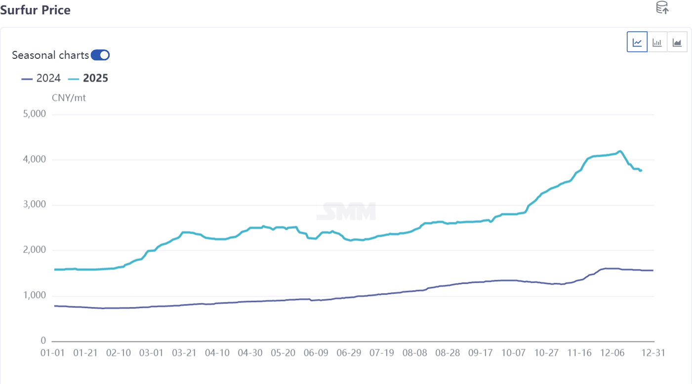 Price volatility was evident: At the beginning of the year, influenced by geopolitical factors, and increases in international crude oil and natural gas prices, sulphur prices quickly surged to the 4,000-4,200 yuan/mt range; in mid-Q4, phosphate chemical enterprises avoided high-priced raw materials through concentrated maintenance, coupled with industry policy guidance, prices stabilized after peaking and slightly corrected to below 4,000 yuan/mt. With the increase in winter fertilizer preparation demand, the tight supply situation will continue, and there is still upward pressure on prices.
