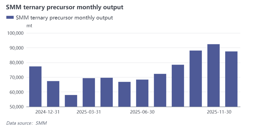 On a monthly basis, domestic ternary precursor production schedules in 2025 showed distinct seasonal characteristics. Market performance was relatively mediocre in H1, with precursor output at low levels early in the year due to the traditional off-season. Starting in March, production activities gradually recovered, driven by front-load orders prompted by rising cobalt sulphate prices. Entering H2, production schedules continued to climb in preparation for the traditional stockpiling peak season of September and October. Coupled with expectations that some NEV subsidy policies would phase out in 2026, demand was further front-loaded, pushing ternary precursor supply and demand to its annual peak in October. After the traditional peak season, front-loaded demand was largely released, downstream cargo pick-up pace slowed down, and industry production schedules are expected to weaken by year-end, entering a phase of adjustment.