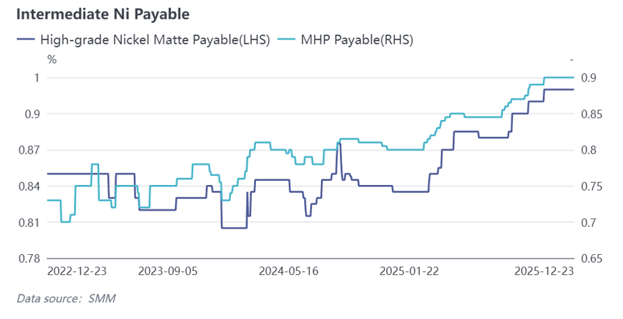 1. Externally Purchased Intermediate Product Processing: Regarding intermediate product payables, MHP payables in Q1 began an upward trend driven by production cuts of high-grade nickel matte, rose again during the Indonesian floods in Q2, and continued to surge from the end of Q3 to the present, driven by demand for ternary materials, refined nickel, and cobalt. Meanwhile, due to relatively limited circulation and higher production costs, the coefficient for high-grade nickel matte also kept rising, supporting nickel sulphate costs. In terms of nickel prices, as refined nickel projects continued to commence production while downstream demand growth remained relatively weak, accumulating inventories suppressed nickel prices, leading to an overall YoY decline, which lowered nickel salt production costs. Overall, nickel salt production costs pulled back from the mid-2024 highs, but as nickel sulphate prices also declined YoY, the profit margin for externally purchased production did not improve significantly.