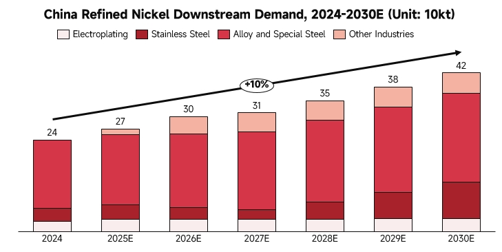 Alloy Special Steels: This segment shows the most certain and robust growth, serving as the primary driver of overall demand. The underlying logic is the rapid rise in demand for high-purity nickel driven by the upgrade of China's high-end manufacturing (aerospace, military, wind/PV mounting brackets, high-end tool steels, nickel-based superalloys, etc.).