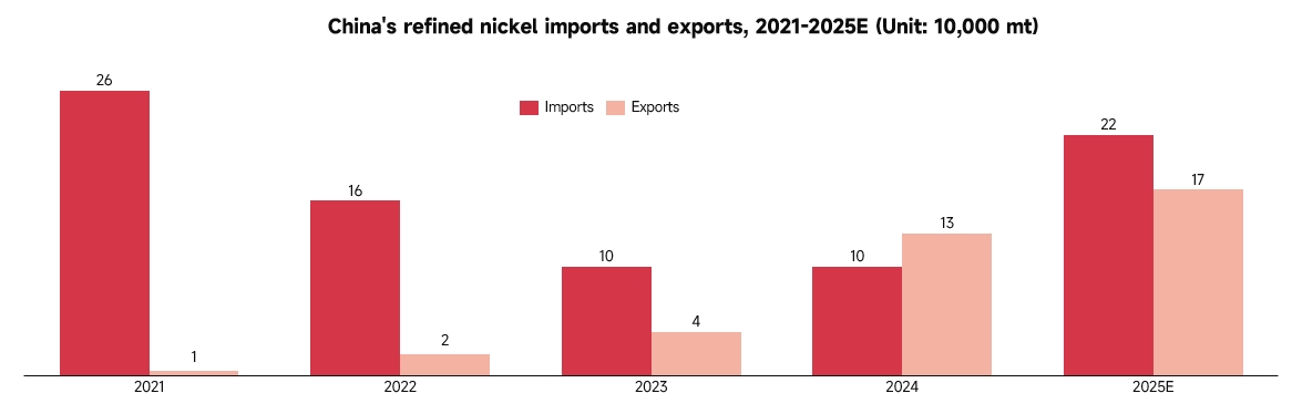 In 2025, the net export position of refined nickel in China is further strengthened. On the import side, due to the explosive growth in domestic electrodeposited nickel capacity, which largely covers domestic demand, the inversion of prices between the domestic and overseas markets becomes the norm. Traditional import brands such as Russian nickel and Nikkelverk nickel are being replaced by domestically produced electrodeposited nickel, with imports of refined nickel declining from 260,000 mt in 2021 to 100,000 mt in 2024, a cumulative decrease of 62%. However, imports are expected to rebound in 2025, reaching 220,000 mt, up 120% YoY. On the export side, the surplus of domestic refined nickel intensifies in 2025, and enterprises must alleviate pressure through exports. Given the strong cost advantages of electrodeposited nickel, it is price-competitive when exported to Southeast Asia and Europe. Domestic brands like Huayou and GEM have successively obtained LME delivery qualifications, leading to a gradual increase in export volumes, with 2025 exports projected to reach 170,000 mt, representing a compound annual growth rate of 141%.