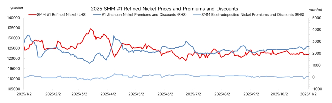 2025 Q3: Nickel prices moved sideways within the 120,000-125,000 yuan range. Cost support coupled with off-season demand meant the market lacked a one-way driver; electrodeposited nickel capacity was released, and global inventories continued to accumulate. Jinchuan nickel premiums fluctuated rangebound between 2,000-2,500 yuan, while electrodeposited nickel maintained a discount.