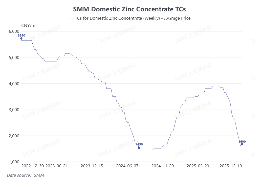 On December 25, SMM recorded the guidance price for domestic zinc concentrate TCs in January 2026 at 1,200–1,600 yuan/mt in metal content, with an average price of 1,400 yuan/mt, down 600 yuan/mt MoM. Throughout the year, domestic zinc concentrate TCs rose first and then fell. In Q4, domestic zinc concentrate TCs largely repeated last year's pattern, with domestic zinc concentrate TCs seemingly set to return to historically low levels. However, recently, sentiment in the domestic zinc concentrate market has shown signs of warming up. Why is this