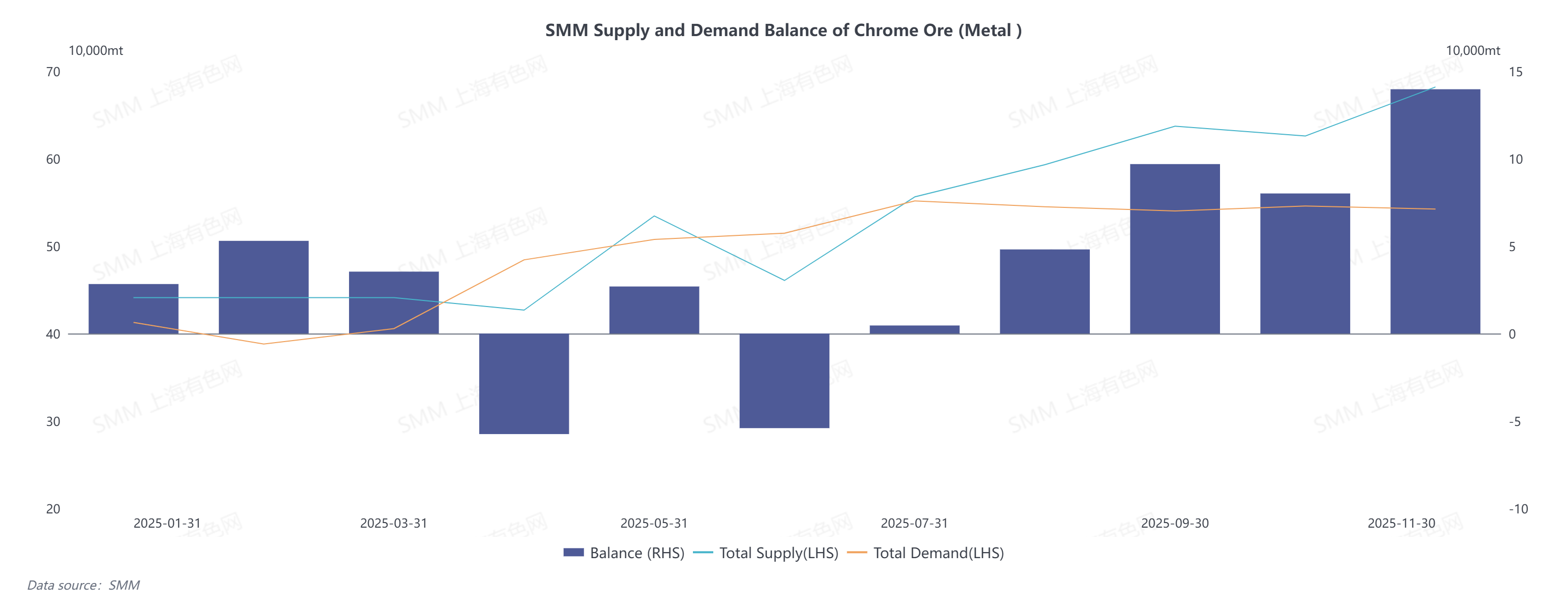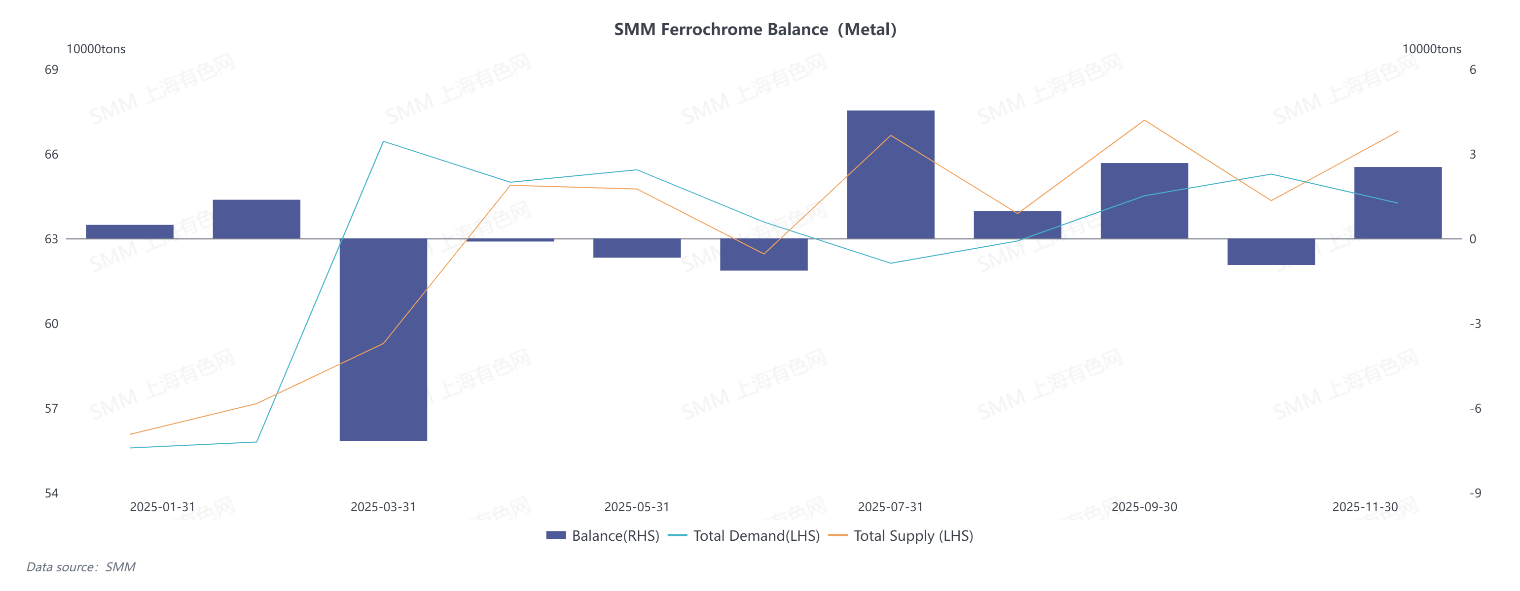 Against the backdrop of booming supply and demand, China’s ferrochrome market maintained an overall tight balance in 2025. Supply was notably tight in the first half of the year; after the supply gap was filled in the second half, the market tilted toward looseness, with an expected slight surplus of 47,700 metal tons.