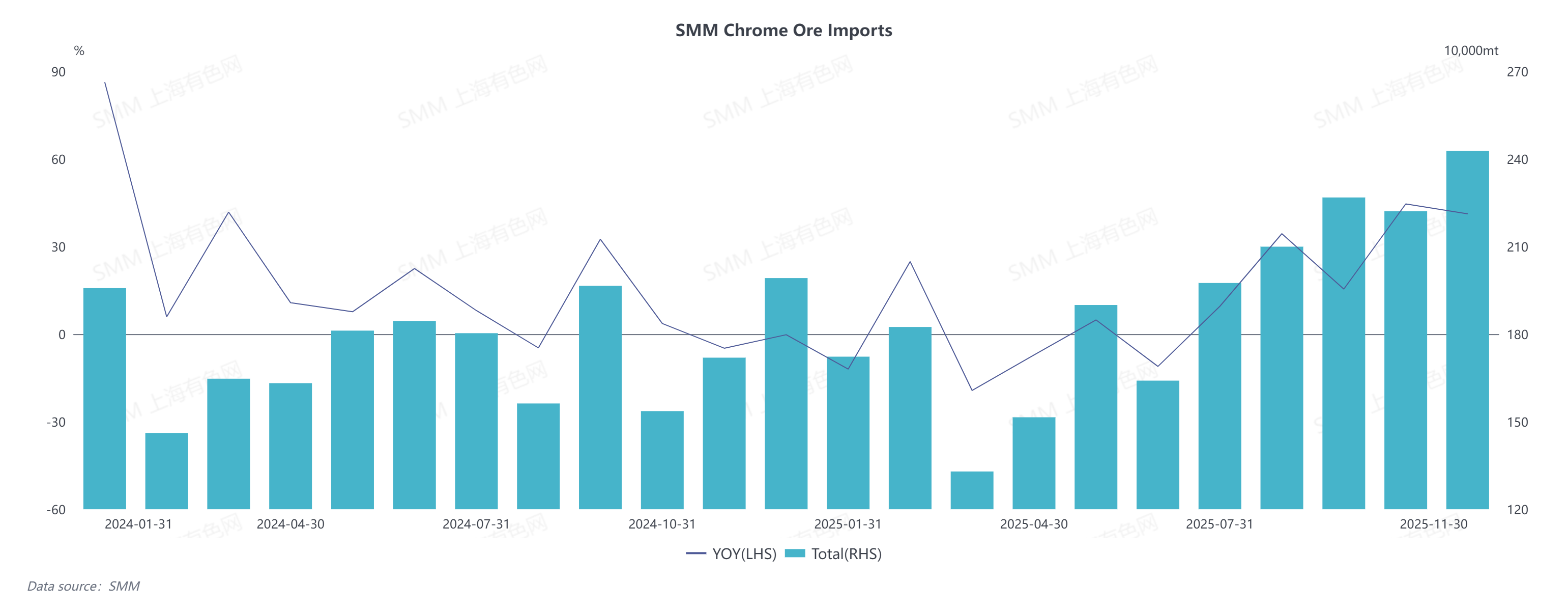 On the import front, China's total chromite ore imports reached 20.922 million tons in the January–November period of 2025, a year-on-year increase of 10.46%. Specifically, imports from South Africa accumulated to 17.3298 million tons, up 12.58% year on year; imports from Turkey totaled 734,100 tons, down 25.46% year on year; and imports from Zimbabwe hit 1.6497 million tons, registering a year-on-year surge of 46.29%.