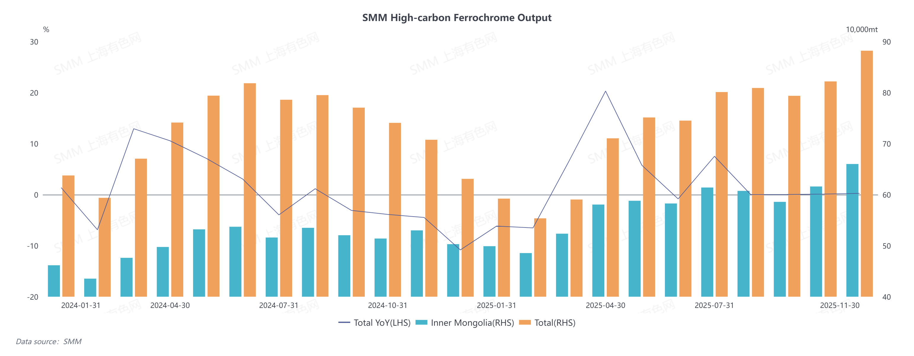 In 2025, China’s high-carbon ferrochrome output demonstrated a stepwise growth trend, with an overall year-on-year increase of approximately 2.76%, and exceeded the historical peak to approach 900,000 tons in November.