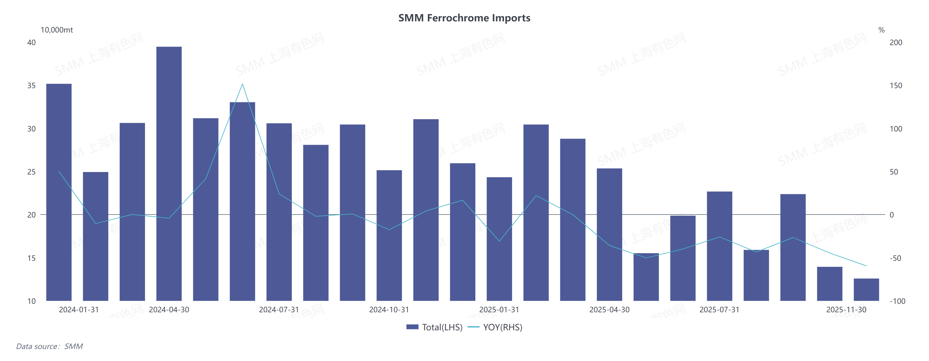 In the January–November period of 2025, the total import volume of high-carbon ferrochrome reached 2.3187 million tons, a year-on-year decrease of 31.76%. Specifically, imports of high-carbon ferrochrome from South Africa accumulated to 955,100 tons, down 43.13% year on year; while imports from Kazakhstan totaled 941,900 tons, registering an 18.36% year-on-year decline.