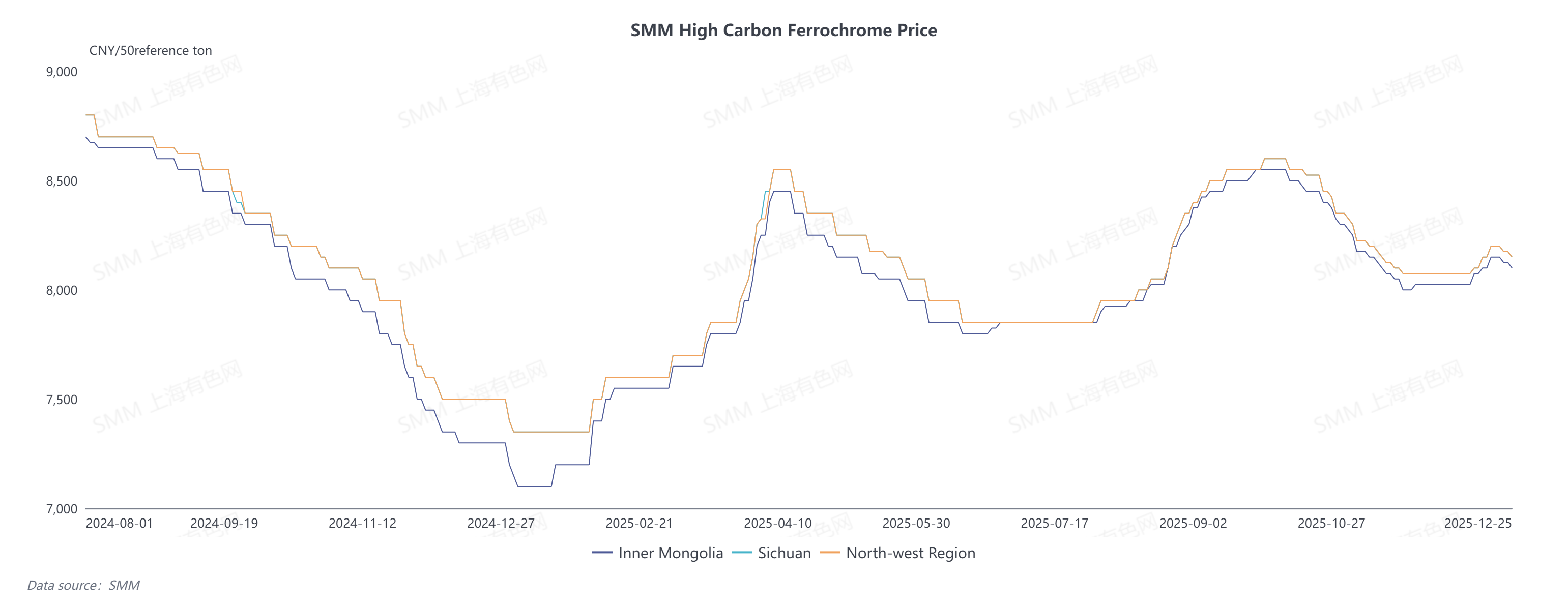 Affected by adjustments in the fundamental supply-demand relationship, the price of high-carbon ferrochrome in China fluctuated sharply in 2025, hitting a peak of 8,600 yuan per 50 basis tons and a trough of 7,100 yuan per 50 basis tons, with a price difference of over 1,500 yuan.