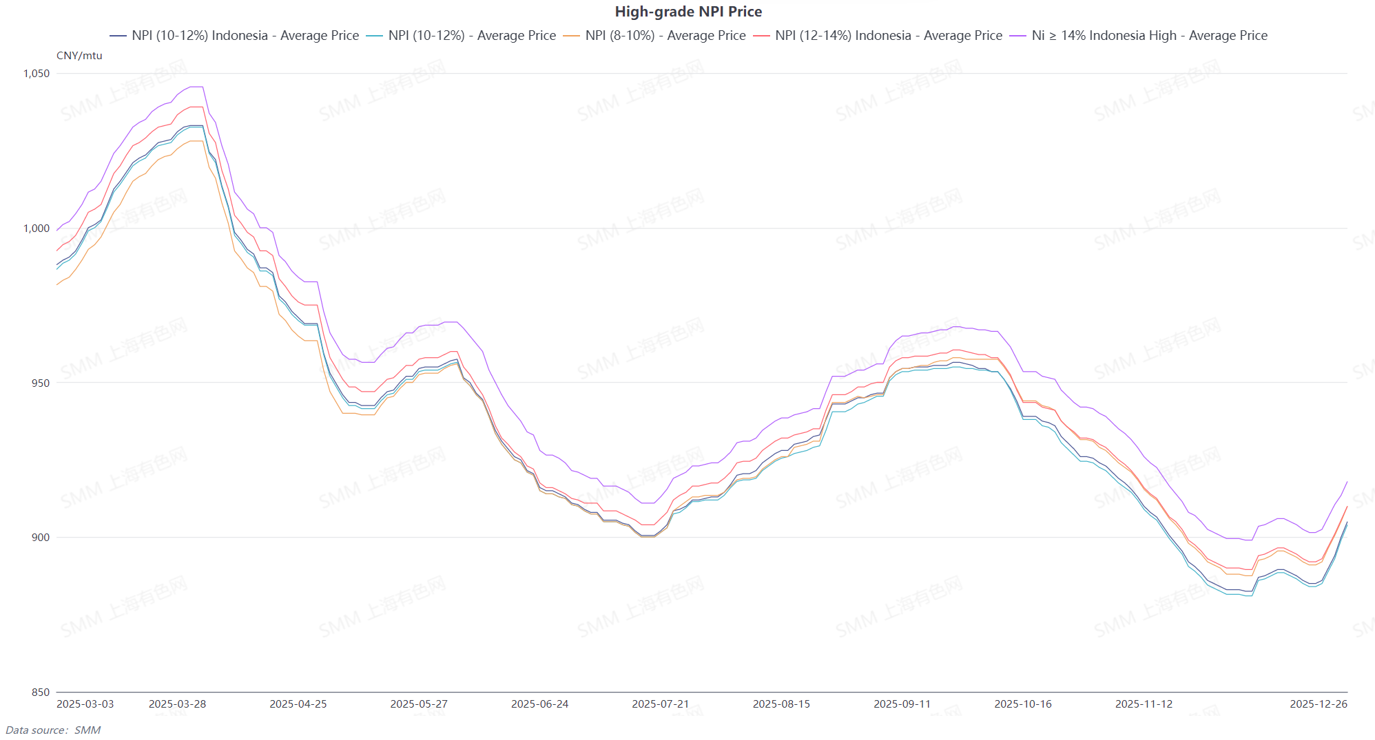 Supply side, macro sentiment and cost support spurred upstream players to hold prices firm. With the price uptrend relatively clear, participation from upstream and downstream enterprises and traders increased markedly, market trading activity recovered, providing a floor for high-grade NPI prices. Demand side, stainless steel spot prices rose, and approaching year-end, some steel mills had restocking needs, while traders' stockpiling sentiment also picked up. Overall, market sentiment recovered, upstream and downstream activity improved significantly, and high-grade NPI transaction prices increased, with further upside room expected in the near term.