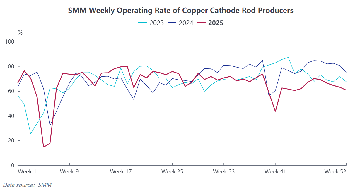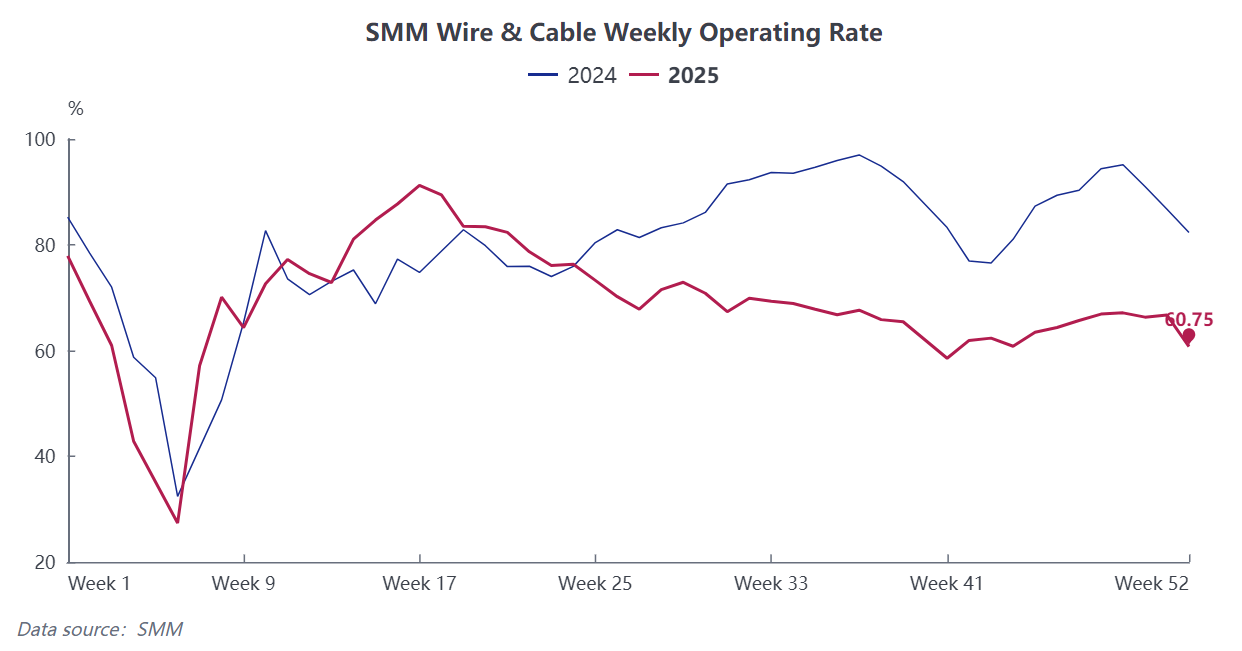 The wire and cable industry faced severe price inversion between orders on hand and current copper prices, significantly increasing operational pressure. Most enterprises began production cuts, resulting in an overall bleak performance, with the majority indicating that production workshops would suspend operations during the 2026 New Year holiday. According to SMM data, the weekly operating rate for SMM copper wire and cable enterprises (December 19–25) was 60.75%, down 5.96 percentage points WoW and 21.57 percentage points YoY.