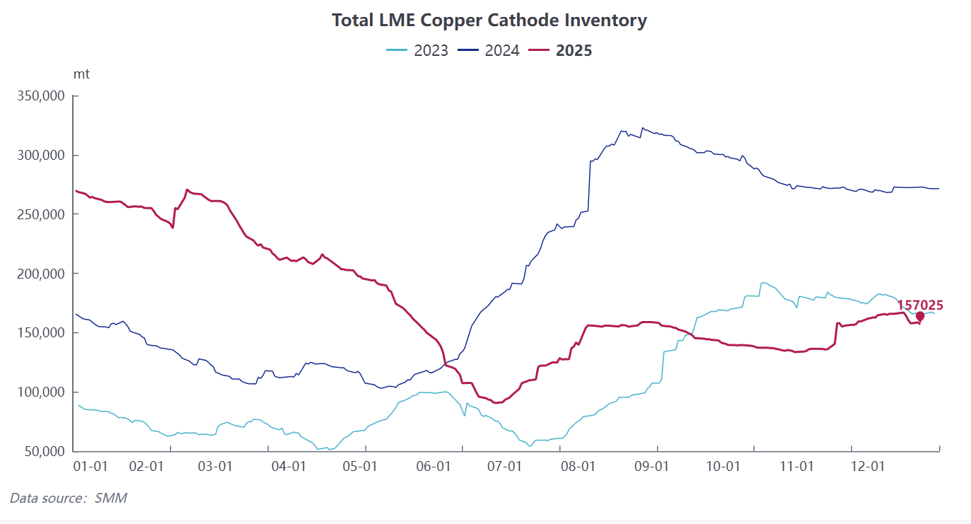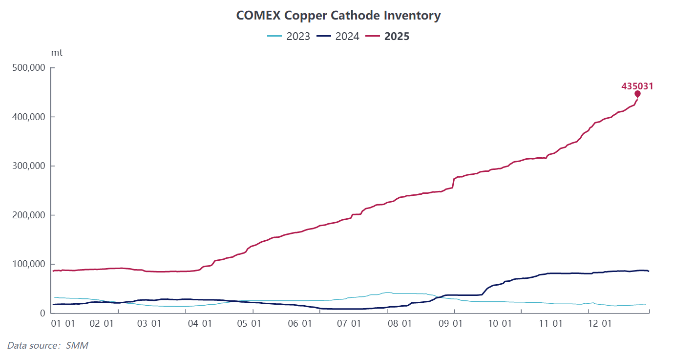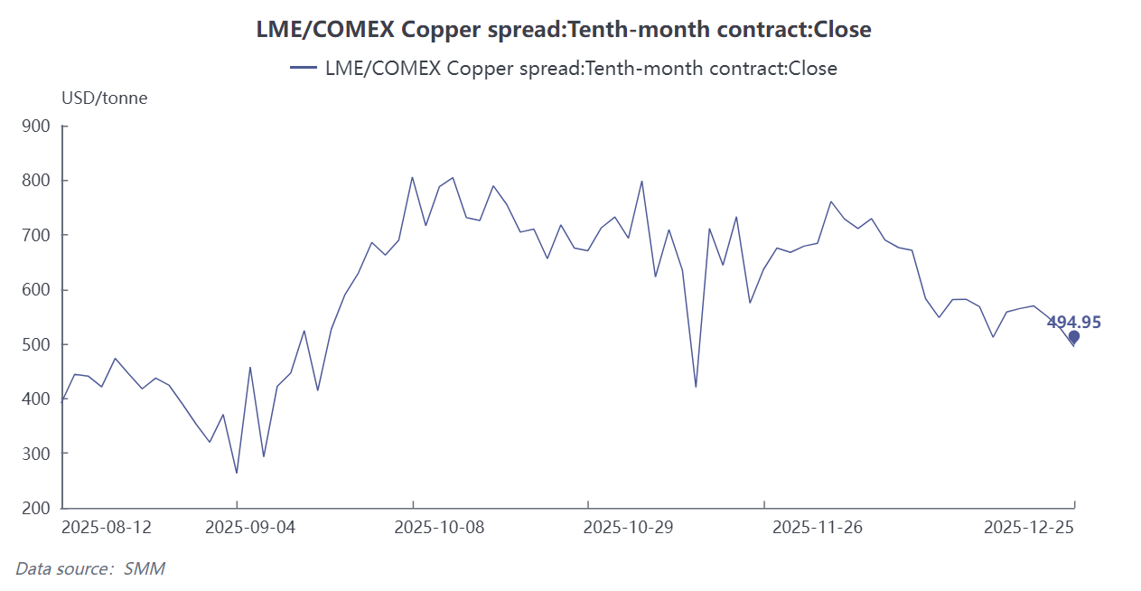 3. Imbalanced inventory distribution Under the expectation of US tariffs, the CL forward spread remains above $500/mt, leading to a continued concentration of copper cathode in the COMEX market. As of December 24, COMEX inventories rose to a record high of 475,400 short tons, while LME warehouse inventories in Asia gradually declined, exacerbating regional supply tightness and squeeze risks.