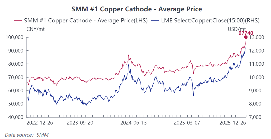 This round of sharp copper price increases resulted from ore supply tightness, the reshaping of global copper cathode trade, the emergence of new demand, and macro-financial resonance. As of December 26, 2025, the SMM spot copper price reached 97,740 yuan/mt, up 33% from the beginning of the year; by the close of that day, the most-traded SHFE copper contract closed at 98,720 yuan/mt, up 34.7% from the start of the year. Downstream semi-finished copper product enterprises generally face challenges such as high costs, pressured processing fees, and shrinking profits. Under pressure from both "continuously rising raw material costs and persistently difficult-to-increase processing fees," they are struggling to survive. Below are the core reasons for the rise in copper prices and the impact of high copper prices on downstream processing enterprises:
