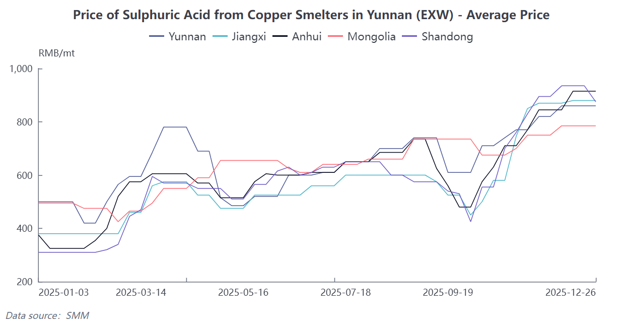 2. Risk of losses in the smelting sector Copper concentrate TCs have currently fallen to a historical low of -$44.9/dmt, meaning smelters are effectively paying to process ore. However, thanks to high sulphuric acid prices and revenue from by-products such as gold and silver, smelters are either marginally profitable or near break-even. With domestic long-term contracts dropping to $0/mt in 2026 and potential pullbacks in sulphuric acid prices, some smelters may see reduced production, limiting the flexibility of copper cathode supply.