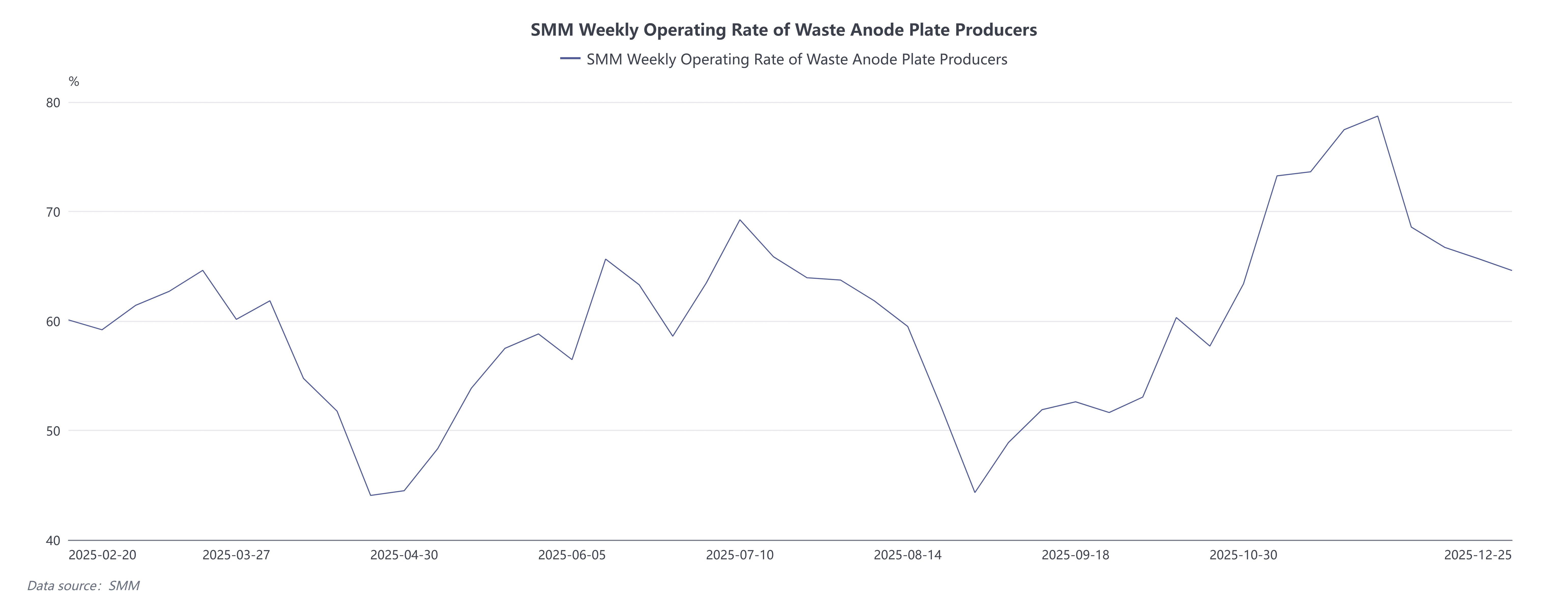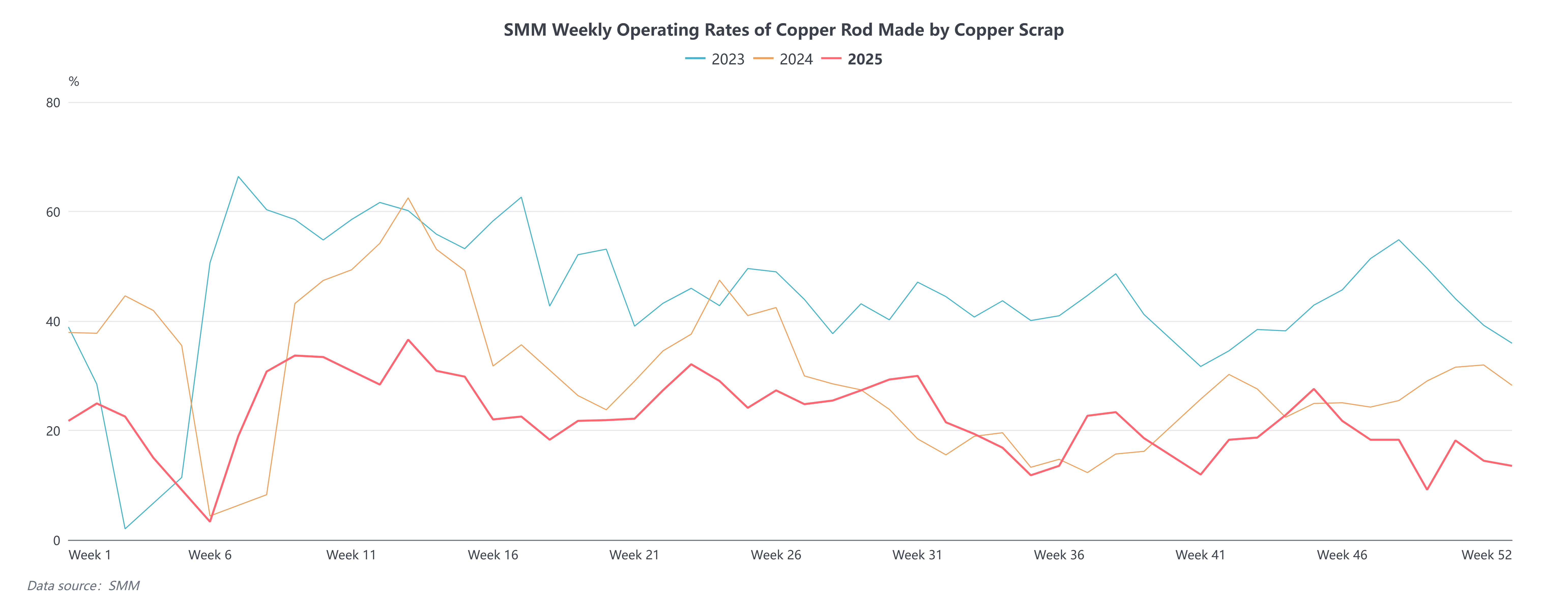 Since mid-to-late September 2025, copper prices have surged strongly and rapidly, repeatedly hitting record highs. As of now, the SHFE copper 2601 contract reached a peak of 99,730 yuan/mt, while the tax-exclusive bare bright copper price climbed to a high of 85,700 yuan/mt. Driven by the rapid rise in copper prices, the tax-inclusive price difference between primary metal and scrap continued to widen, once exceeding 5,000 yuan/mt. Historically, rapid copper price increases have inevitably prompted holders of recycled copper raw materials to increase sales, leading to a widening price difference between primary metal and scrap. This enhances the economic advantage of copper scrap relative to copper cathode, boosts the operating rate of secondary copper rod enterprises, and increases the production of secondary electrolytic copper, thereby raising expectations for higher copper cathode production and restrained consumption. However, the actual situation has significantly diverged from theoretical expectations during the recent copper price rally. According to SMM data, the weekly operating rate of sampled secondary copper rod enterprises in H2 2025 further declined compared to the same periods in 2024 and 2023, even hitting a record low (excluding the impact of the Chinese New Year holiday). This contrasts sharply with the same period in 2024, when rising copper prices drove up operating rates at dismantling enterprises, spurred active sales by suppliers, and fueled strong purchasing sentiment among downstream traders and wire and cable enterprises. Against the backdrop of ample raw material supply, the operating rate of secondary copper rod continued to climb. In 2025, despite copper prices repeatedly reaching new highs, the operating rate of secondary copper rod remained persistently low. Meanwhile, the weekly operating rate for scrap-produced anode plates continued to rise during the copper price increase.