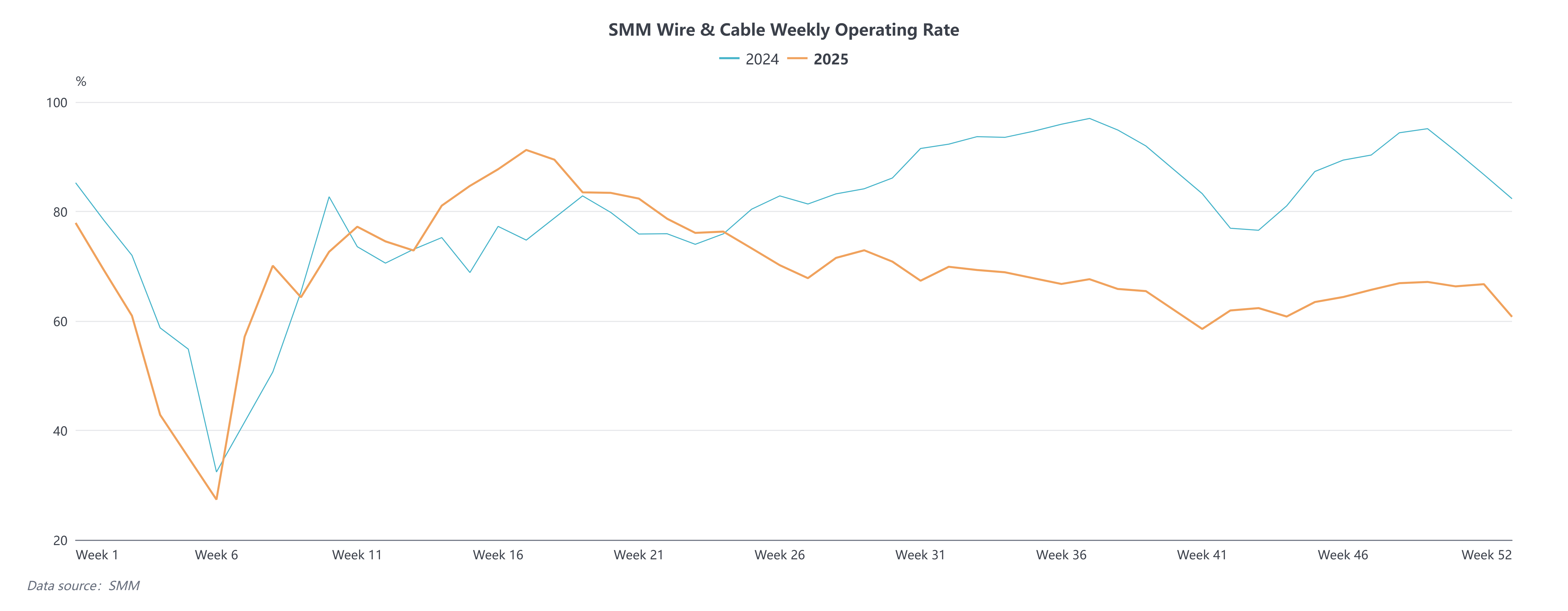 Enterprises generally adopted a "delayed procurement" strategy in the high copper price environment, purchasing only when delivery was imminent, which made it difficult for price increases to effectively boost immediate consumption. According to SMM, the operating rate of sampled wire and cable enterprises in the weekly survey showed a significant decline compared to the same period in previous years, as high copper prices suppressed end-use consumption demand.