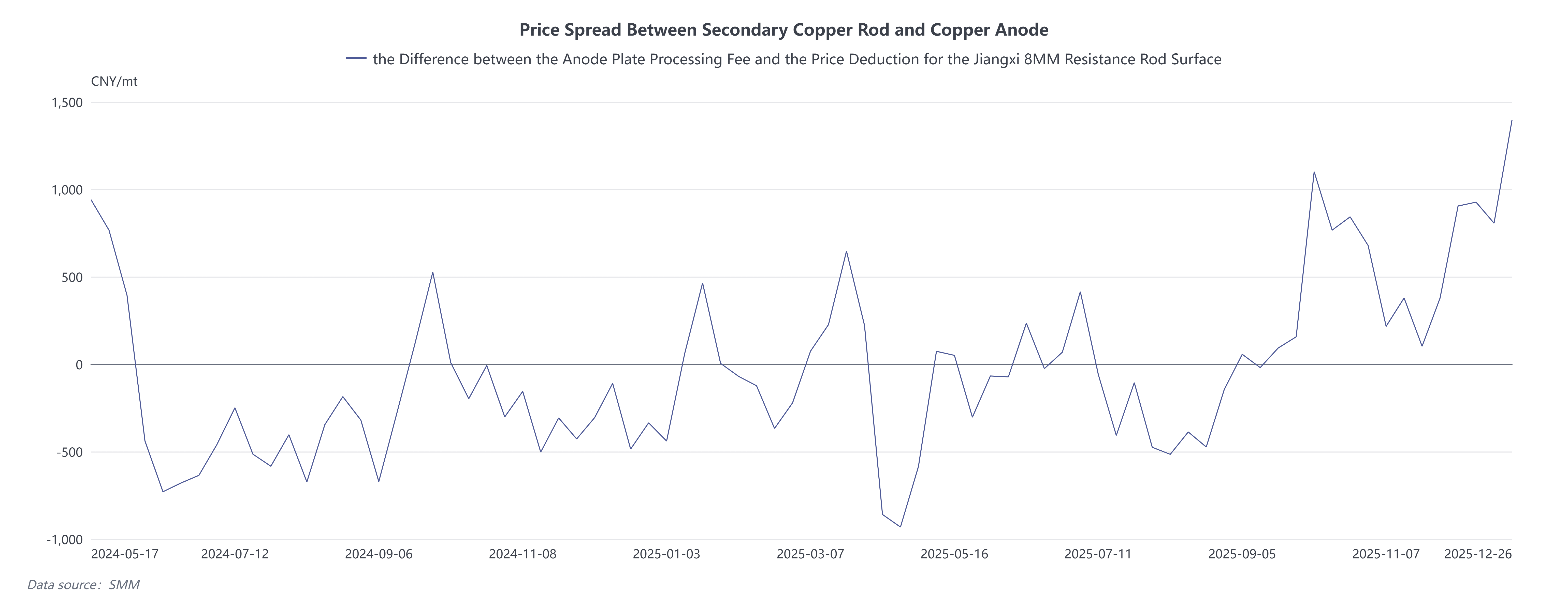Looking ahead, as policy-related issues in the recycling industry remain unresolved, the price difference between primary metal and scrap is expected to remain wide. Policies will continue to impact the decline in secondary copper rod production while boosting anode plate production. The price difference between primary metal and scrap is projected to maintain a range of 3,000–4,000 yuan/mt in the medium and long term.