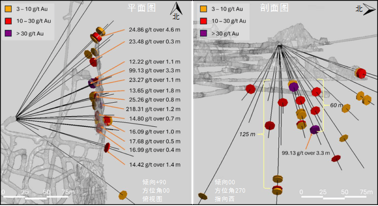 ◎ Hole TGC-0457 intersected 1.2 meters grading 218.31 grams per tonne gold at a depth of 109 meters, including 0.6 meters grading 366.00 grams per tonne gold.