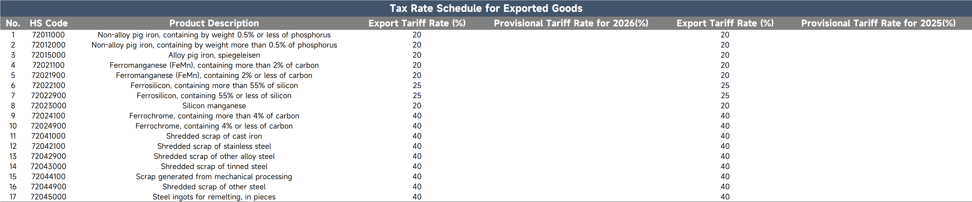 Compared to the 2025 tariff adjustment plan, there were no changes to the import and export tariff rates for steel-related products in 2026. Additionally, no adjustments were made to the tariff lines for steel-related products this year.