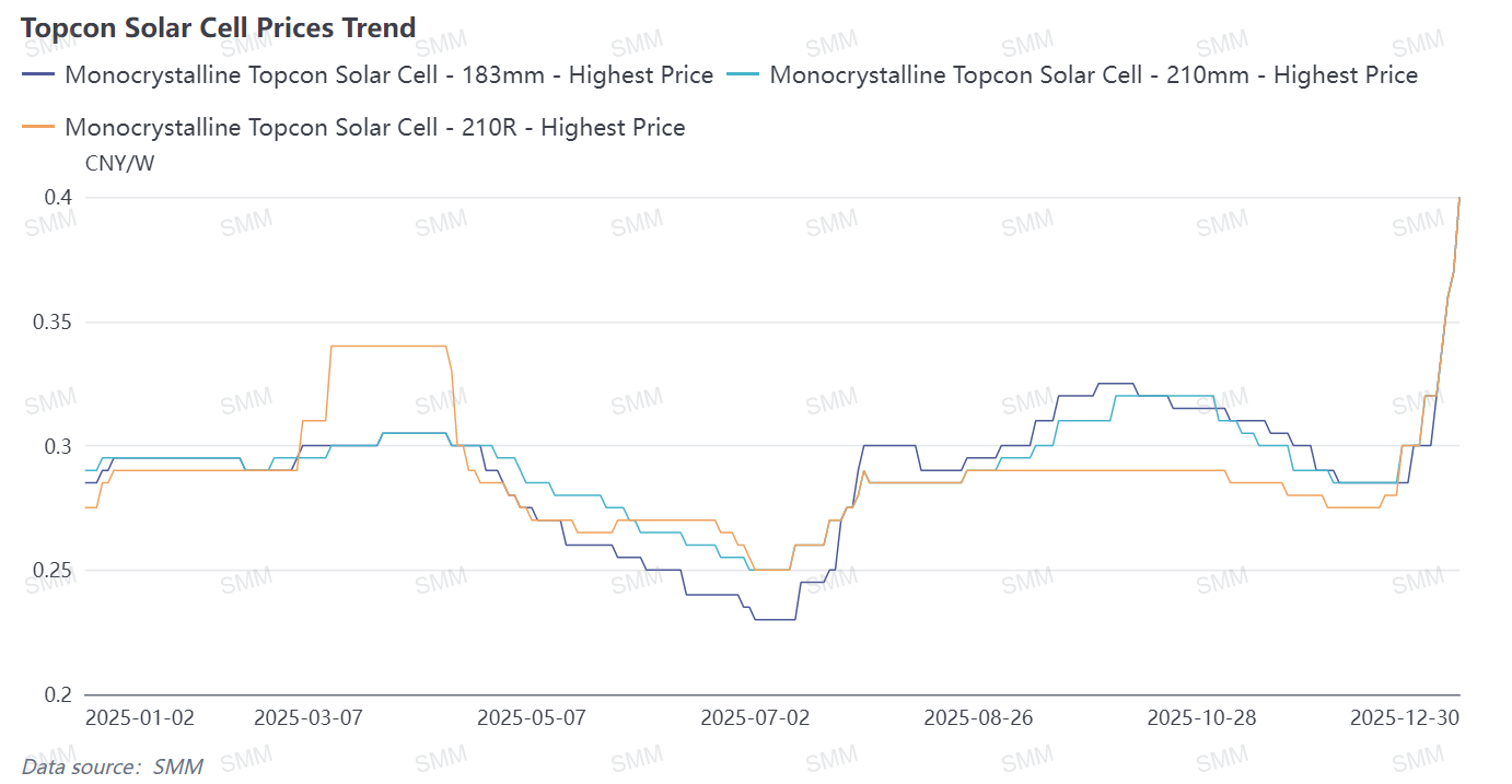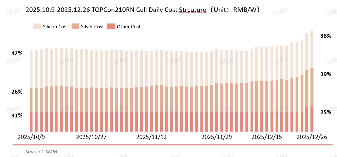 This round of price increases originated from the raw material side. The sustained rise in the spot price of domestic #1 silver has directly led to corresponding increases in the price of silver paste used for TOPCon cells, for which silver is a core material. According to SMM's cost model calculations, the production cost for 210RN cells has risen from approximately 0.27 yuan/W in October to around 0.33 yuan/W as of last Friday. From a cost structure perspective, silver paste now accounts for nearly 40% of the production cost for TOPCon cells, making the total cost highly sensitive to its price fluctuations. A rough estimate suggests that for every 1,000 yuan per kilogram increase in the silver price, the corresponding cell cost rises by about 0.01 yuan/W. The recent rapid surge in silver prices has quickly elevated the overall manufacturing cost of cells through increased silver paste expenses.