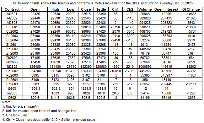 The following table shows the ferrous and nonferrous metals movement on the SHFE and DCE on 30 Dec , 2025