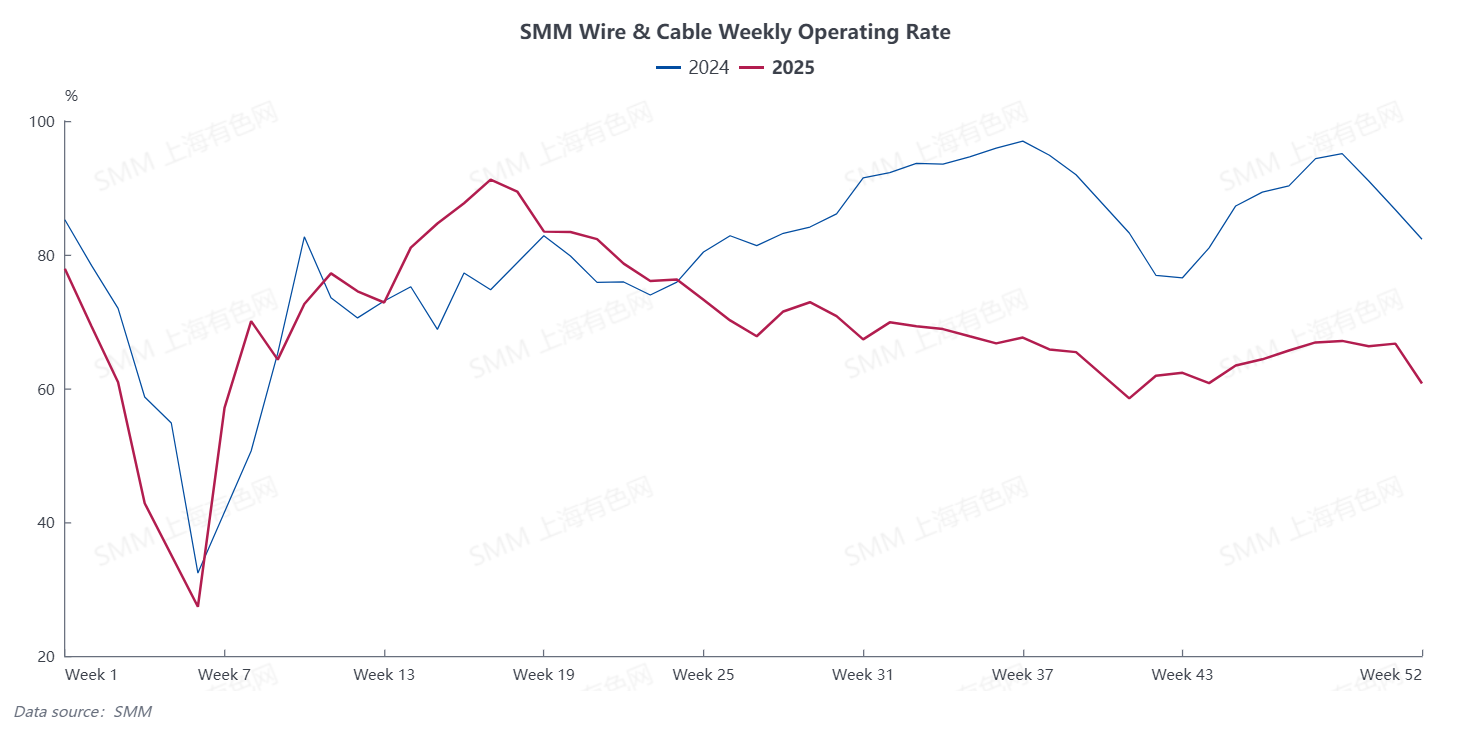Persistently rising copper prices significantly dampened downstream purchase willingness, with new orders remaining weak. Coupled with the approaching New Year holiday, most wire and cable enterprises faced inverted pricing between orders on hand and current copper prices, leading to losses upon operation. As a result, they proactively opted for holiday shutdowns to mitigate risks. This week, the industry's operating rate dropped to 58.95%, marking a YoY decline of 18.95 percentage points. Currently, enterprises exhibit a strong wait-and-see sentiment after the holiday, and combined with the holiday impact, the operating rate may further decline to 56.88% next week.