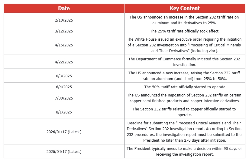 Against the backdrop of the US continuing to strengthen its “supply security” and “critical minerals” policy framework, base metals with high import dependency have increasingly come under market scrutiny. Historically, similar logic has already materialised under Section 232 in steel, aluminium and selected key metals. Within this context, zinc has been persistently viewed by the market as a potential candidate for closer policy attention.