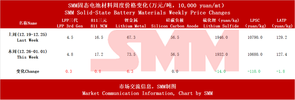 Preface: Weekly price situation. Prices for cathode materials in the solid-state battery industry have risen, while lithium metal anodes have increased and silicon-carbon remains stable. The prices of solid-state battery-specific materials, such as lithium sulfide and electrolytes, have decreased.