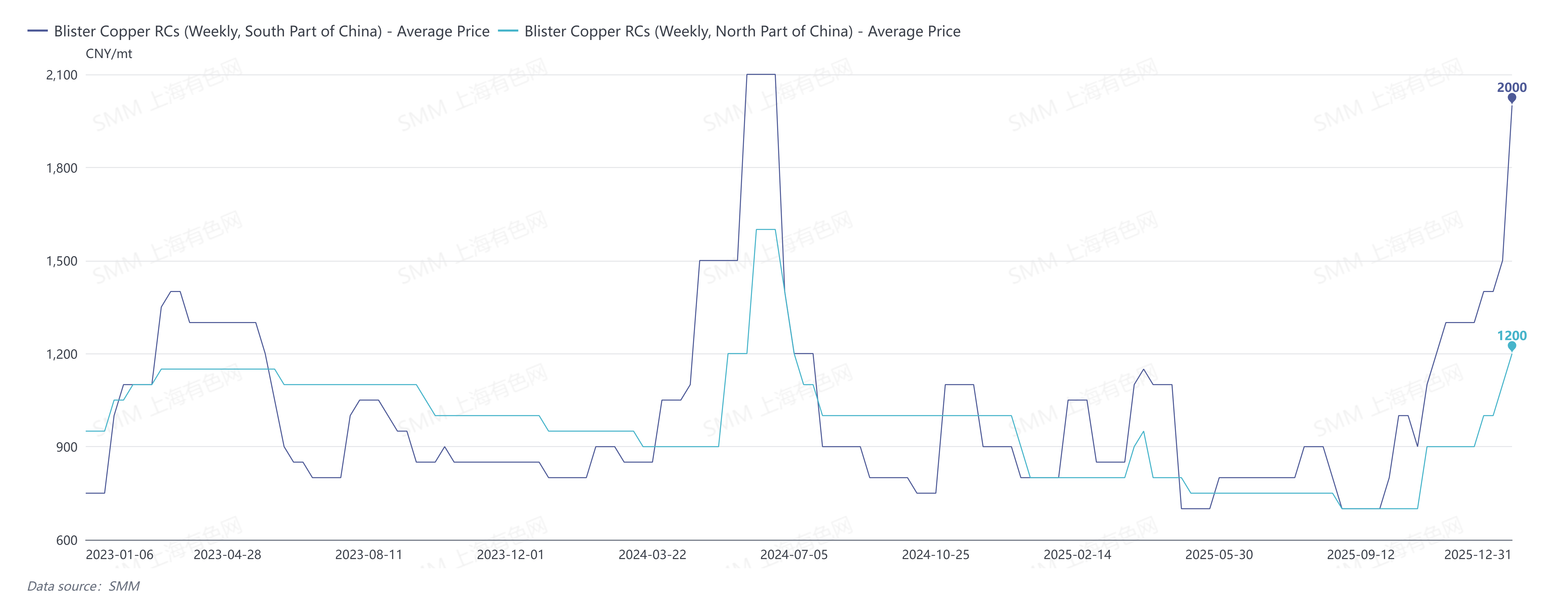 SMM's December 2025 blister copper RCs in south China were quoted at 1,400-1,600 yuan/mt, with an average of 1,500 yuan/mt, up 250 yuan/mt MoM; blister copper RCs in north China were quoted at 900-1,200 yuan/mt, averaging 1,050 yuan/mt, up 150 yuan/mt MoM; blister copper RCs, CIF China were quoted at $90-100/mt, averaging $95/mt, flat MoM.