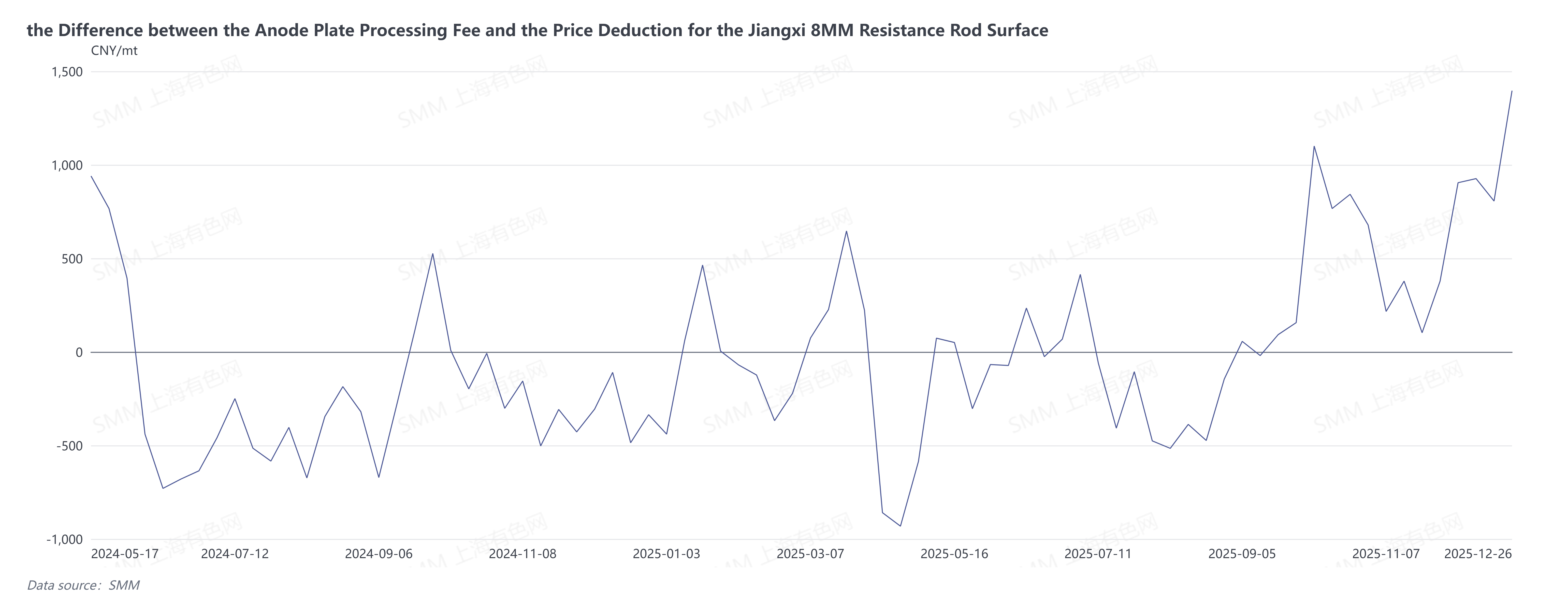 Since Q4, blister copper RCs have continued to rise, with supply-side expansion as the core driving factor. Copper prices surged significantly in December, boosting the price difference between primary metal and scrap to widen notably; meanwhile, secondary copper rod faced severe discounts, with the price spread between Jiangxi's 8mm secondary copper rod and copper anode processing fees exceeding 1,000 yuan/mt. This boosted the supply of raw materials such as secondary copper, scrap-derived blister copper, and copper anodes. On the demand side, smelters scaled back procurement volumes during the year-end period due to inventory control and capital flow needs, leading to a looser secondary raw materials market and supporting higher RCs.