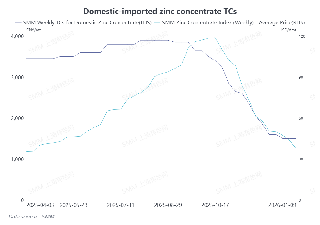 Entering 2026, as of January 6, the average TC for domestic zinc concentrate remained flat at 1,500 yuan/mt in metal content, while the TC for imported zinc concentrate continued to decline to $37.5/dmt. What are the reasons behind this "price spread" phenomenon, and what is the future trend?